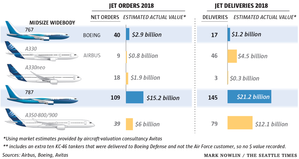 The planes that Boeing delivered were valued at ~$60B versus Airbus’ $54B value. The 737 and the 787 were the most popular models for Boeing, with the A32oneo and A350 the most popular for Airbus. Boeing had 893 net new orders at the end of 2018, valued at $66B. They have almost 20% more unit orders and $14B more in value planned in 2019 as compared to Airbus.