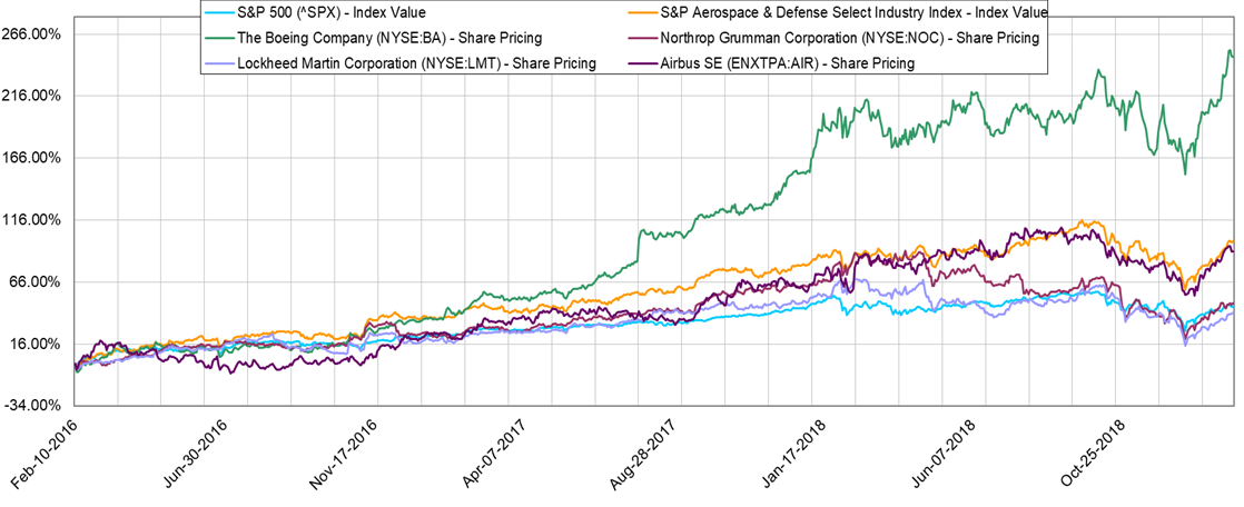 Boeing had strong net income for 2018, with a 10.3% increase from 2017 numbers. Airbus managed to increase their net income by 5.3%, and Lockheed Martin was close behind Boeing at 9.4%. Boeing is expected to increase net income by 10.29% for 2019, bolstered by a 9.87% increase in revenue.