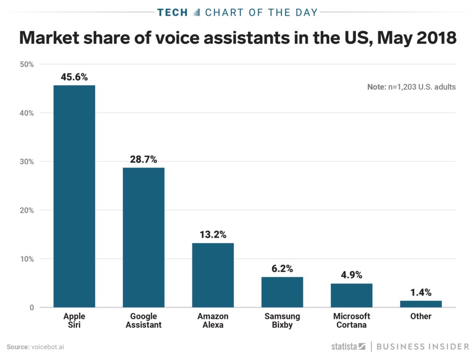 It is important to note that Alexa isn’t immediately integrated into any smartphone, whereas Google is automatically on 400M Android devices, giving them easy access to their target market. Apple is still in the lead in this segment of the industry, which is bad news for Google, as every time someone searches for something with Siri, that takes search market share away from Google.
