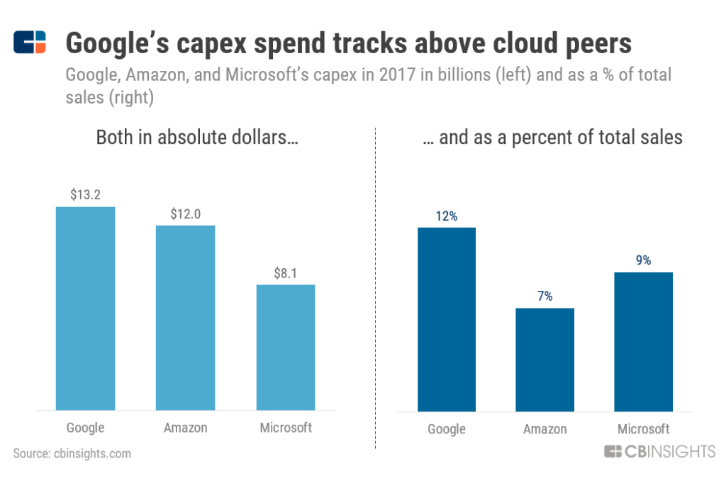 Google had aggressive capital expenditures for 2018, outspending both Amazon and Microsoft with a $25.5B total for the year. That was 2.25x more than Amazon and 1.6x more than Microsoft. The CAPEX number was obviously for more than just cloud services, but the company has made it clear that the cloud unit is a priority for them, with the CEO saying that “the most sizeable (hiring) increases were in cloud, for both technical and sales roles“.