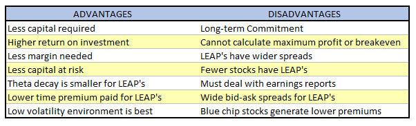 The analysis is a simple outline of what can be done with this bullish diagonal, and can be adjusted with risk-return preferences and time constraints. This tactic prefers a move slightly to the upside, preferably above our current stock price. This also prefers a low volatility environment, that way the fluctuations won’t be so intense throughout the life of the trade. The below graphic details the advantages and disadvantages of the bullish diagonal. We are not using LEAPs in this analysis.