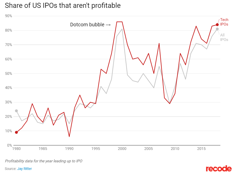 Despite Uber Eats, ATG, ridesharing, and micromobility, Uber still does not make any money. In 2018, more than 80% of US companies were unprofitable in the 12 months prior to their IPO. That’s almost at the level of the dotcom bubble. People are willing to pay for disruptors, or for companies that appear to have “long-term future expansion” opportunities, believing that “the companies’ future profits will eclipse these current losses”.