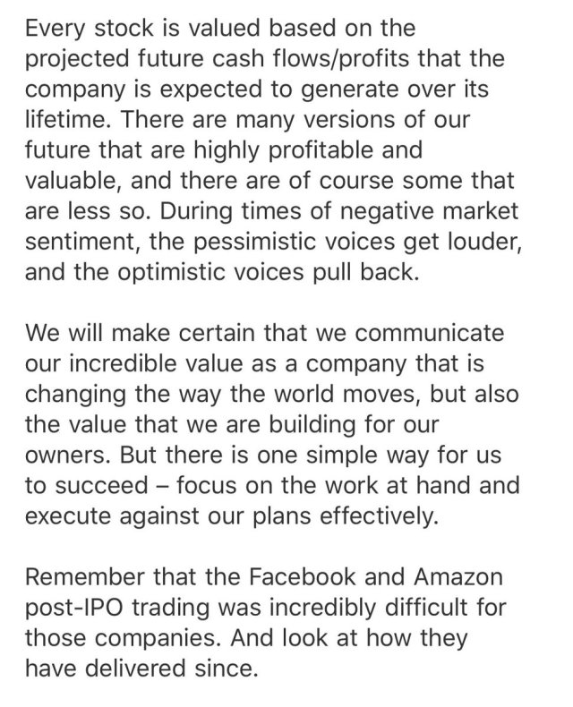 Uber’s CEO sent an email to employees on May 13th, stating “Obviously our stock did not trade as well as we had hoped post-IPO… remember that the Facebook and Amazon post-IPO trading was incredibly difficult for those companies… We will be judged by our long term performance”. Read the whole letter here.