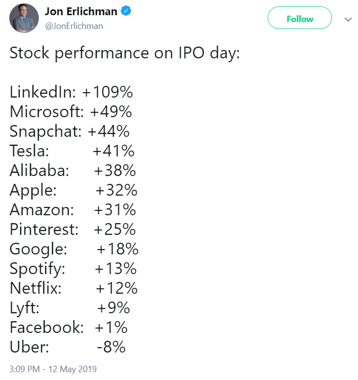 A good quote by Luke Stein states “winning the IPO game is not equal to winning the game“. There’s a lot more that comes after the first few trading days. In fact, this underperformance might be better in the long run. The investment game is longer than just a few days. But it’s still ugly. No one likes to lose money. A lot of people have a lot of skin in the Uber game, and daily trading declines are not what they want to see.
