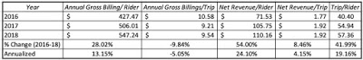 When the data are broken down per rider, it is a pretty strong growth story. They had 91M monthly riders, and 5.2B rides. They’ve been able to build out their net revenue per rider, but the annual gross billings per trip has declined. That could mean that their international expansion could be working against them, as rides abroad tend to be less expensive.
