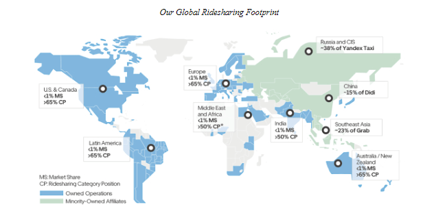 According to the Uber’s S1, they are prevented from competing with their minority-owned affiliates abroad, including China and Southeast Asia until 2023 and Russia until 2025. Both Didi, based out of China, and Yandex Taxi, based out of Russia, have no restrictions on competing with Uber.