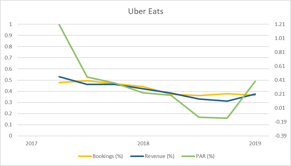 Uber had a tough Q4 2018, primarily because of this increase in competition. Revenues compressed across the board, with Uber Eats declining 13.6% quarter over quarter, and ridesharing declining 0.8%.