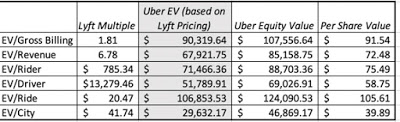 It’s tough to value Uber. Aswath Damodaran, a professor at NYU, has done an excellent job at looking at different methods to value the company. Based on the company metrics available, Uber can be valued anywhere between $39.89, based on number of cities, to $105.61, based on number of rides.