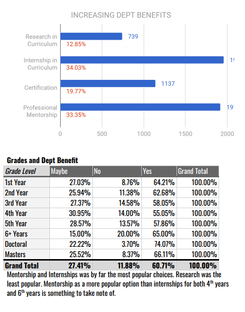 [COLONNADE SHOULD BE] Here I kept focus again on the color scheme but wanted to depict the story in a bar graph with break out data points. I then filtered that data out by grade level, once again organized by color density and percentages. So most first years think that the process should be more major specific, and most older students think that it should be more flexible.