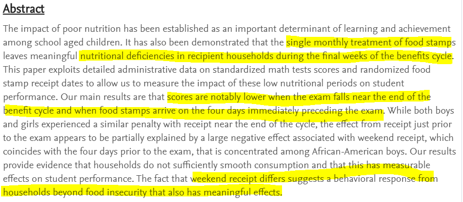 Math scores tend to be higher when children receive their benefits at the beginning of the month, and drop when they’re late in the benefit cycle. This is extremely important to consider as students are judged more and more on the results of testing.