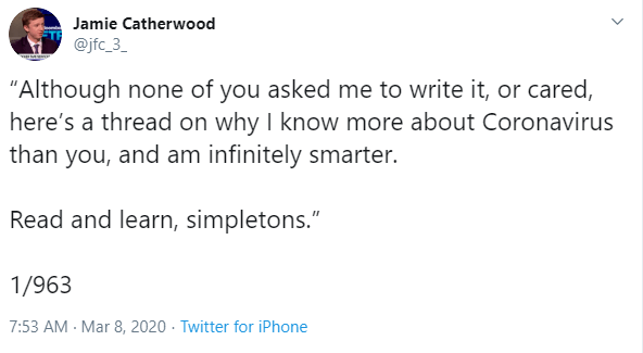 And truly, I have no value-add to the COVID-19 conversation. I am not an epidemiologist. I am not a virologist. I can summarize what I know and what I think, but that simply wouldn’t be of value to anyone. You can go on Twitter and get the opinions of thousands.