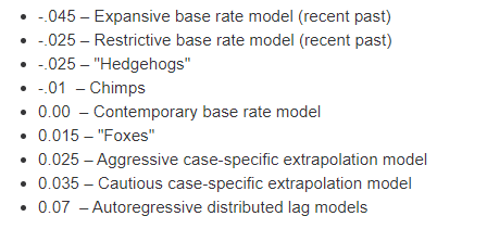 Autoregressive models did the best according to Tetlock, as “the best human forecasters were hard-pressed to predict more than 20 percent of the total variability in outcomes…, the generalized autoregressive distributed lag models explained on average 47 percent of the variance”.