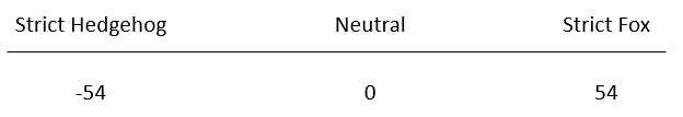 The range of possible outcomes is -54 being the most hedgehoggy and 54 being the most foxy.
