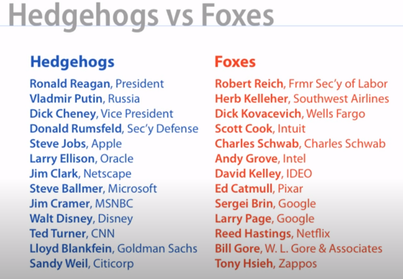 In fact, Tetlock himself says: “The hedgehogs are more the big idea people, more decisive. In most MBA programs, they’d probably be viewed as better leadership material.”