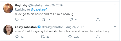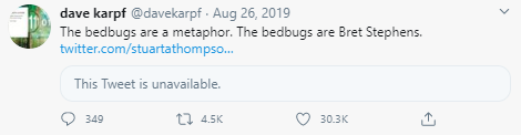 Some background – in sequential order, the New York Times newsroom got bedbugs back in 2019. So Dave Karpf, an associate professor at GWU, called Bret Stephens, a NYT reporter, a bed bug — specifically tweeting: