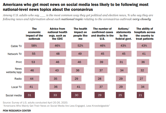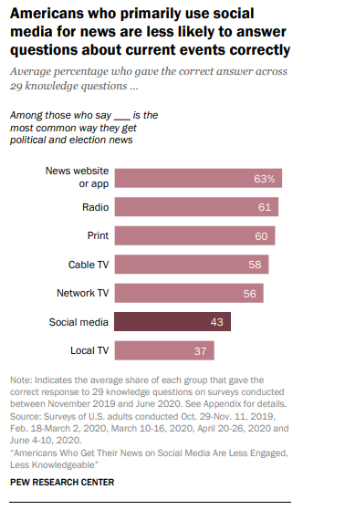 According to Pew Research, when asked 29-fact based knowledge questions about current events, the social media group was more likely to report that they were ‘Not Sure’ rather than giving a yes-or-no answer.
