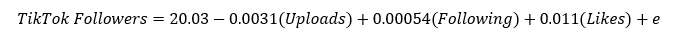 The main takeaway here is that for every video that the creators upload, they lose 2,428 followers, holding all other variables constant. (The uploads coefficient of 0.0023 is expressed in millions here).