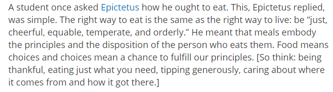 According to Epictetus, the right way to eat is the same as the way to live: “just, cheerful, equable, temperate, and orderly.”