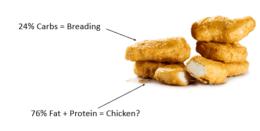 Taking our previous all-white chicken example (chicken is 90% protein and 10% fat): we would expect this remaining 76% of the nugget to be ~8% fat and ~68% protein.