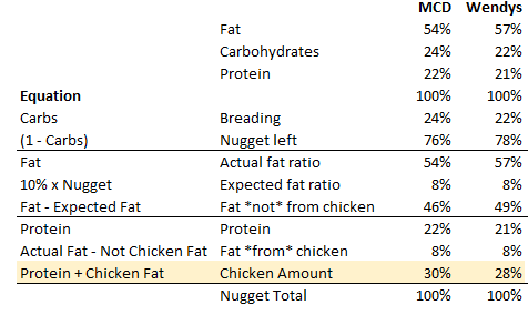 Nope- Wendy’s nuggets are only 28% real chicken! All the math is below.