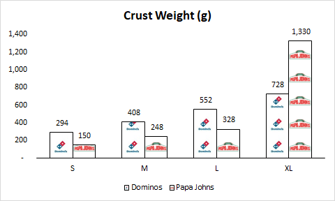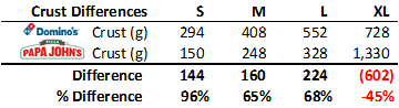 In absolute and percentage terms, it’s the same story. The Domino’s Small Cheese Pizza has 96% more crust as compared to the Papa John’s pizza. The Medium and Large pizza have 65% and 68% more crust, respectively. However, nothing compares to the outlier – Papa John’s XL simply has a ton of crust.