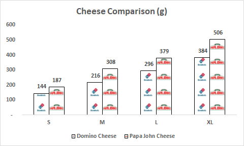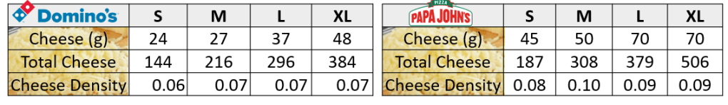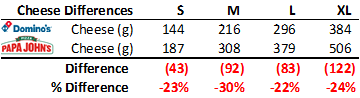As we saw, on a percentage basis, Papa John’s has much more allocation to sauce, relative to Domino’s. But that doesn’t mean that they can’t have more cheese too! The Medium Papa John’s gives you 30% more cheese as compared to Domino’s.