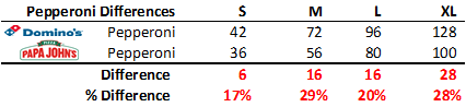 However, Domino’s has much more pepperoni per pizza than Papa John’s. Once again, the Medium pizza is a winner (this time, in Domino’s favor). The Domino’s pizza has 29% more Pepperoni when compared to the parsimonious-pepperoni pizza chain known as Papa John’s.