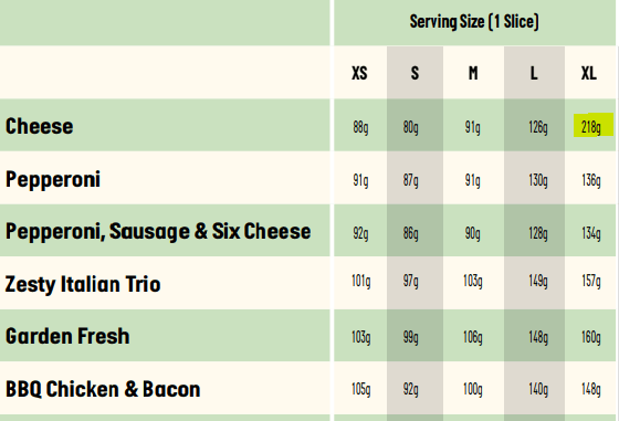 Papa John’s has the least amount of crust allocation, with a heavier emphasis on sauce and cheese (except for the XL).